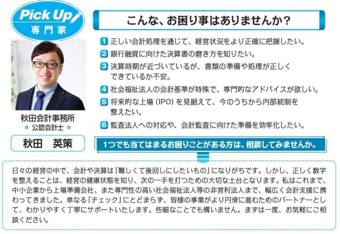 ・秋田会計事務所 秋田 英策 ・(有)タクト経営研究室 代表取締役 中西 弘則 ・藤尾中小企業診断士事務所 代表 藤尾 竜馬 ・(株)マイライフエフピー 代表取締役 加藤 葉子