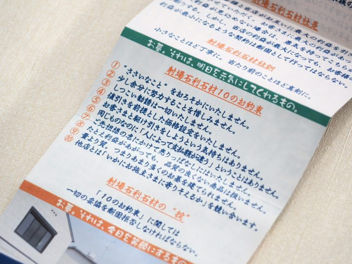 こうしたスローガンや、「少し余分に努力することを惜しみません」「値引きを前提とした価格設定をいたしません」などを明言した射場石利石材の10のお約束には、お客様にまっすぐ向き合う想いや、お店を続けていくための大事な要素が現れています。