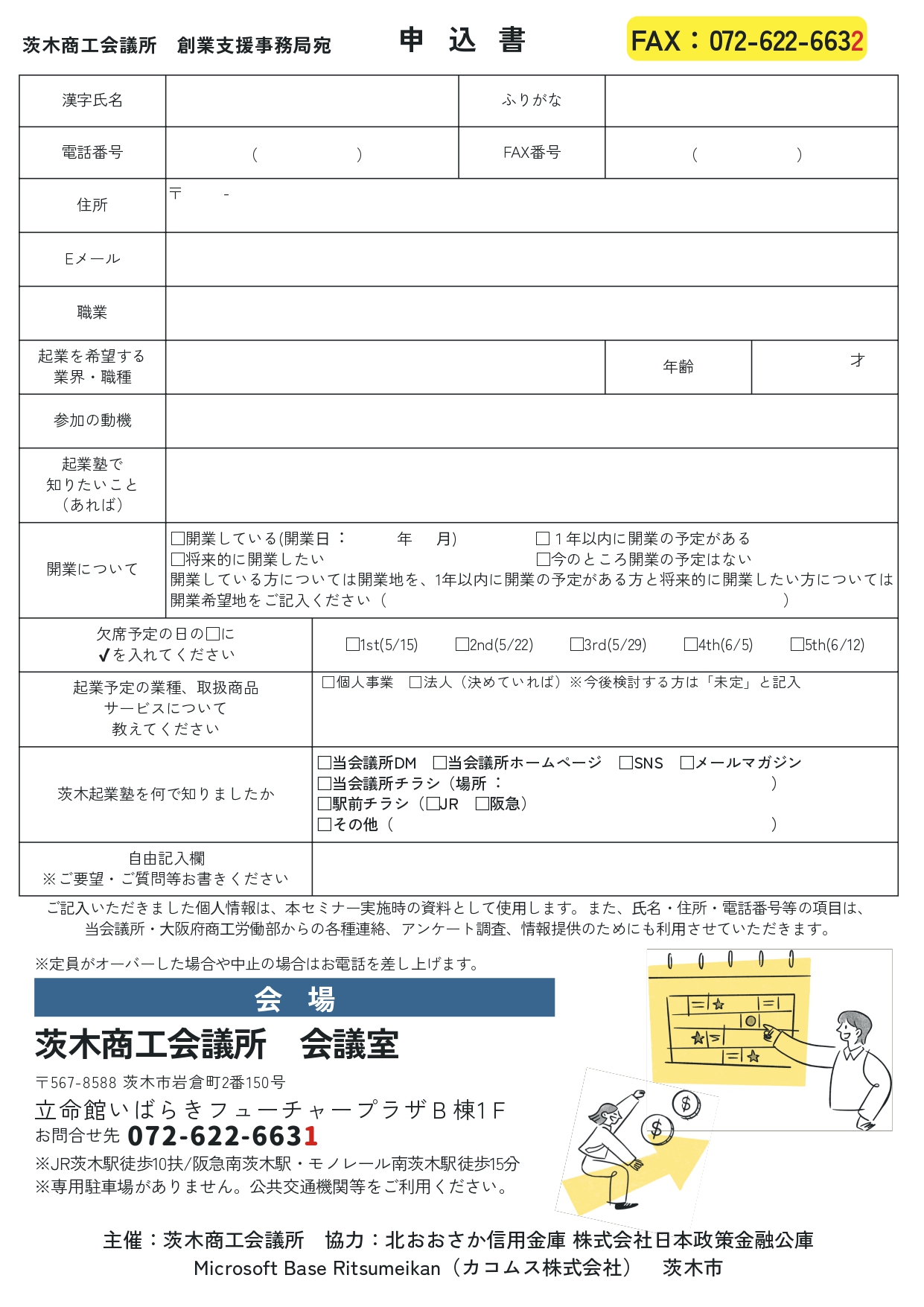 〒567-8588 大阪府茨木市岩倉町2‐150 立命館いばらきフューチャープラザ1F 茨木商工会議所 簿記検定担当宛 TEL:072-622-6631 |