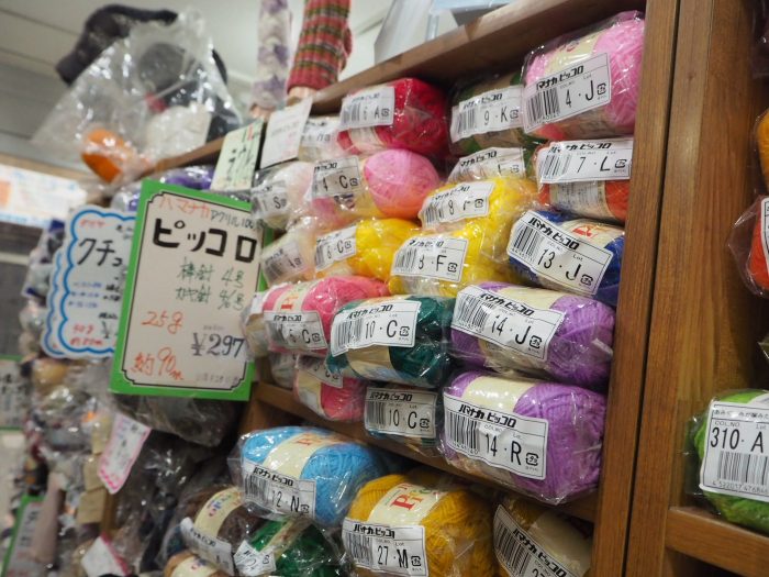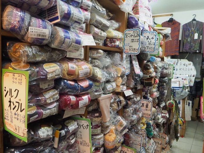 洋服やマフラーなどが店頭に並び、中に入るとさまざまな種類の毛糸がずらり!販売店舗が限られる珍しい化粧品も揃えています。