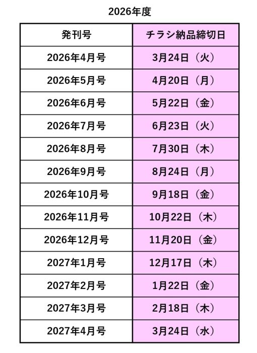 | 納品締切日 | 2026年度スケジュールをご確認ください |