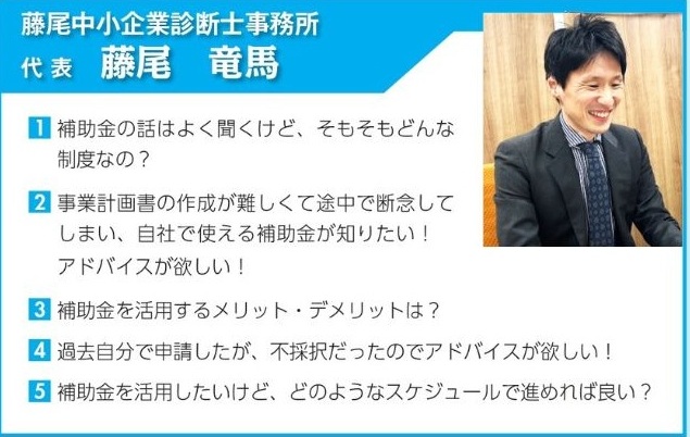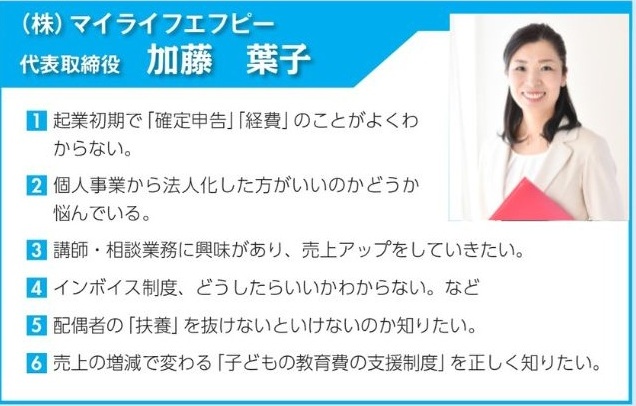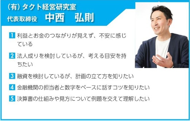 ・秋田会計事務所 秋田 英策 ・(有)タクト経営研究室 代表取締役 中西 弘則 ・藤尾中小企業診断士事務所 代表 藤尾 竜馬 ・(株)マイライフエフピー 代表取締役 加藤 葉子